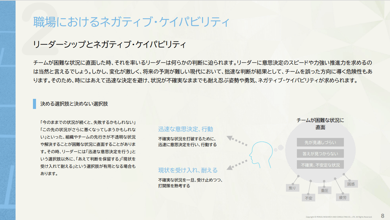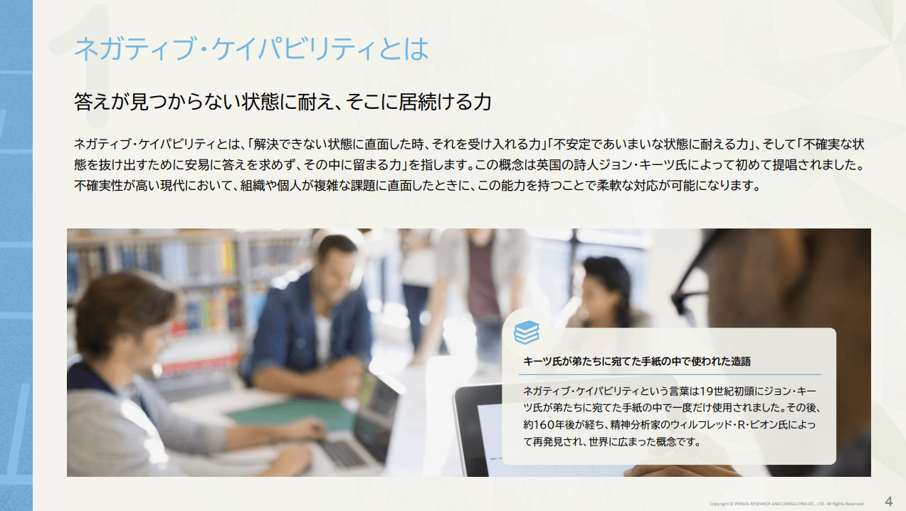 先の見通せない時代といわれる今、企業が直面する課題は「即断即決」だけでは解決できないことも増えています。そこで、一旦立ち止まり、粘り強く考え続けるネガティブ・ケイパビリティの重要性が高まっています。本資料では、ネガティブ・ケイパビリティの基礎から職場におけるネガティブ・ケイパビリティについて解説しています。組織のレジリエンスと多様性を育むヒントとしてご活用ください。