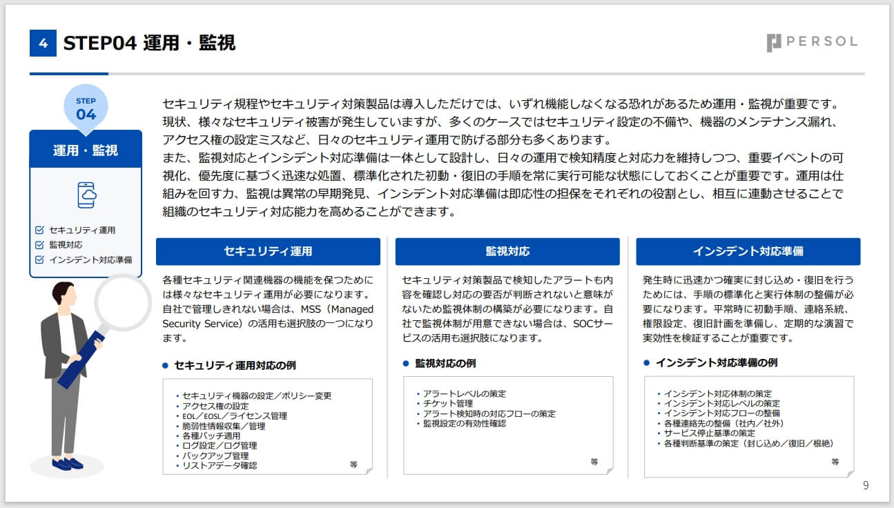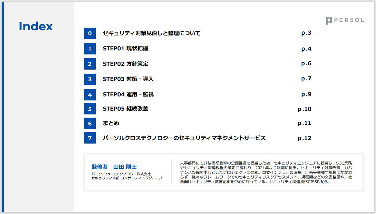 セキュリティ脅威は日々更新されています。また企業のIT環境も日々変化するため、定期的に見直しを行い、変化する状況に対してセキュリティ対策が十分に機能しているかを確認した上で、対策を講じることが望ましいと言えます。本資料では、セキュリティ対策の現状把握から継続改善まで、実効性の高いフローを体系的に解説。事業を守るための確実な一歩を踏み出すために、ぜひご活用ください。