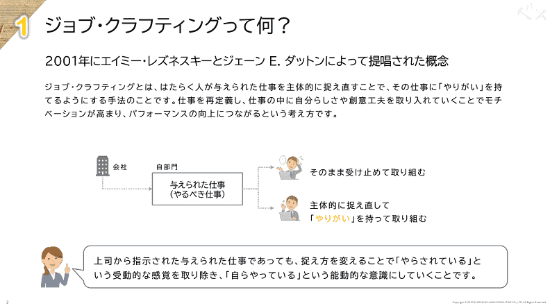・ジョブ・クラフティングの効果と注意点を知りたい方 ・ジョブ・クラフティングを実践につなげるための研修を検討している方 ・従業員のモチベーション向上や仕事のやりがいを促進したい方