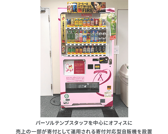 パーソルグループでは、乳がんの早期発見・早期診断の大切さを伝える活動の一環として、寄付対応型自販機の設置を行っています。自販機の売上の一部を通じて、乳がん啓発や検診支援の取り組みを応援しています。