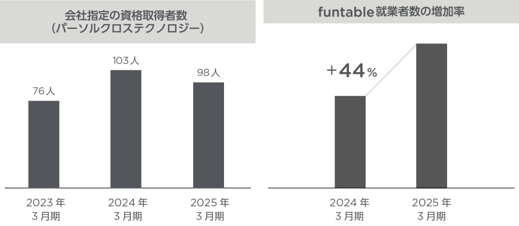 funtableはパーソル独自の取り組みですが、社員雇用に向けた伴走支援に対して派遣スタッフの評価が高く、2025年3月期の就業者数は前年度から44%増加しました。この取り組みがスタートしてから一貫して、就業者数が増えています。funtableの採用者からは、「サポート体制が整っていて心強い」、「ゼロから経験を積んで、やりたい仕事に就くことができた」といった声を頂いています。