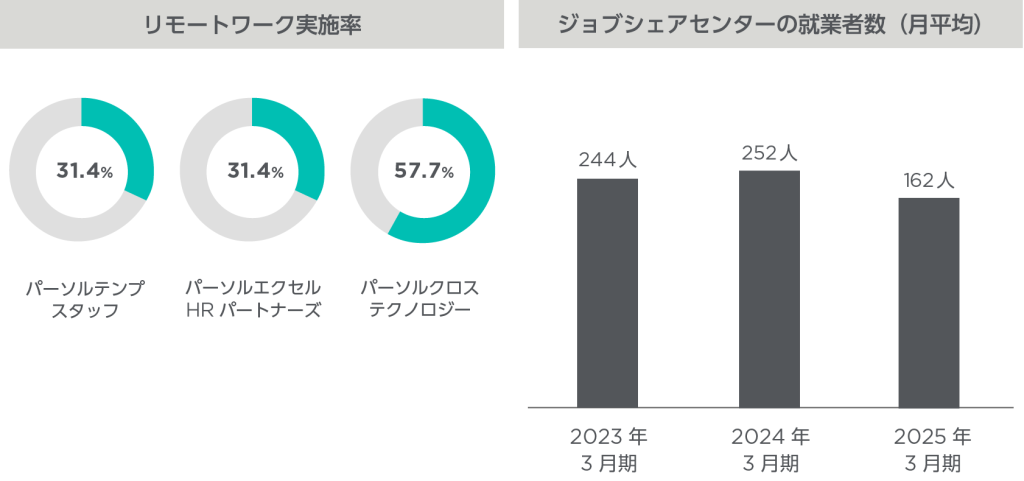 リモートワークの推進も支援しています。2025年3月期において、週に1日でもリモートワークを行っている派遣スタッフの割合はパーソルテンプスタッフで 25.5%、パーソルクロステクノロジーで57.7%に及んでいます。
