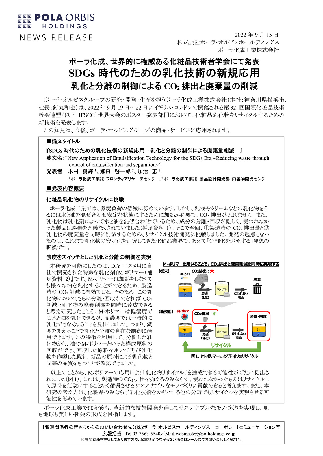 笠原:たとえば、以下は「化粧品乳化物のリサイクル」に関するリリースです。一般的に、乳液やクリームなどを作るには、水と油を混ぜ合わせていかに分離させず安定な状態にするかが重要です。しかし、ある研究員が「逆に分離させる技術を確立すれば、売れ残った商品から必要な成分を回収できるのでは?」というユニークな発想をし、実際に研究を行いました。