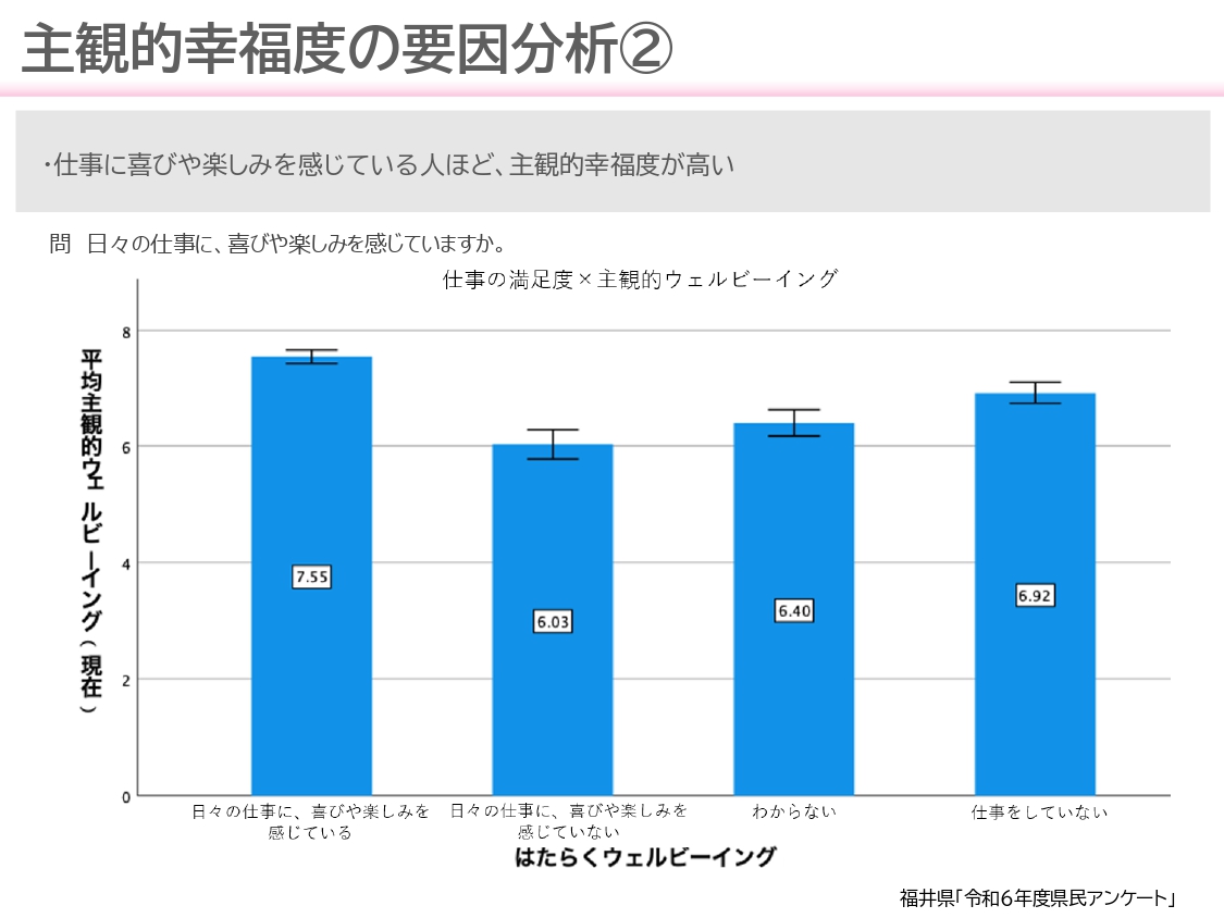 1つ目は、データを分析し「ここに新しい可能性があるかもしれない」というエビデンスを発見するワクワク感ですね。それは福井県の幸福実感の伸びしろであり、希望でもあります。まだ誰も気がついていなかった新たな可能性にチャレンジするのは緊張もありますが、「取り組んでいけば、より良くなるぞ!」と思いながら飛び込んでいくので、幸福実感の数値が上がると今まで以上に大きな達成感を感じます。