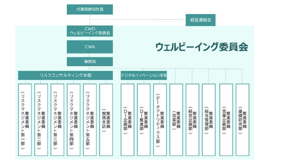 ウェルビーイング委員会は、CWO(Chief Well-being Officer)を務める社長とアドバイザー(CWA)である前社長、私、そして各部から1人ずつ選出された17人で構成されています。年代・性別・経歴は多様です。強く意識したわけではないですが、結果的に多様なメンバーの多様な視点が取り組みに反映されています。
