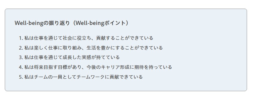 他にも社員一人ひとりが、今どのような状態で仕事と向き合っているのかを把握するために、経営理念や価値観、行動規範に関連した5つの質問に10段階の自己評価を行う「Well-beingの振り返り(Well-beingポイント)」を2021年から年に2回実施しています。