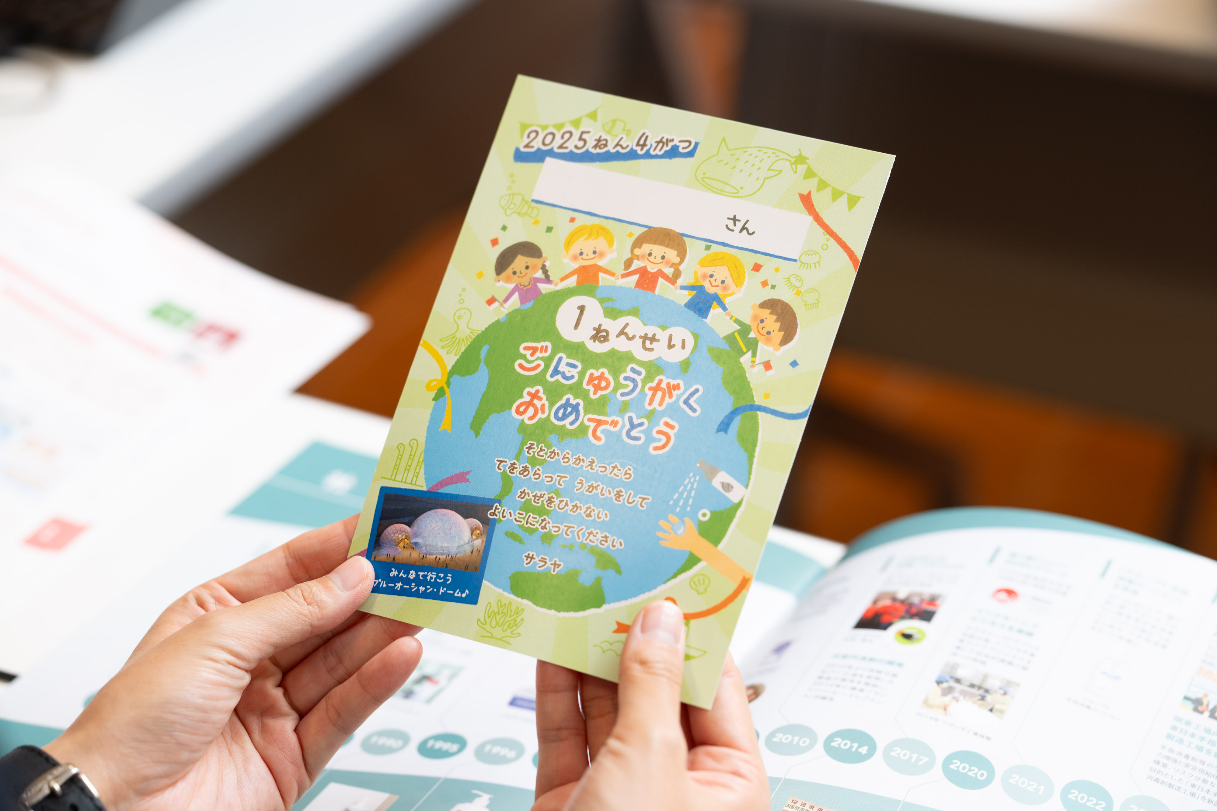 岩原:ほんとうにそうで、サラヤの「絆」は従業員だけでなく、その家族まで含まれています。たとえば、従業員のお子様が小学校に入学する際には、「子女入学のお祝い」という取り組みがあります。これは会社からのメッセージと、手洗い石けんや消毒液、うがい薬「コロロ」などの製品一式をプレゼントするものです。加えて、従業員からお子様の入学式の写真を共有してもらい、「〇〇さんのお子さんが小学校に入学しました!」と社内イントラに掲載しています。