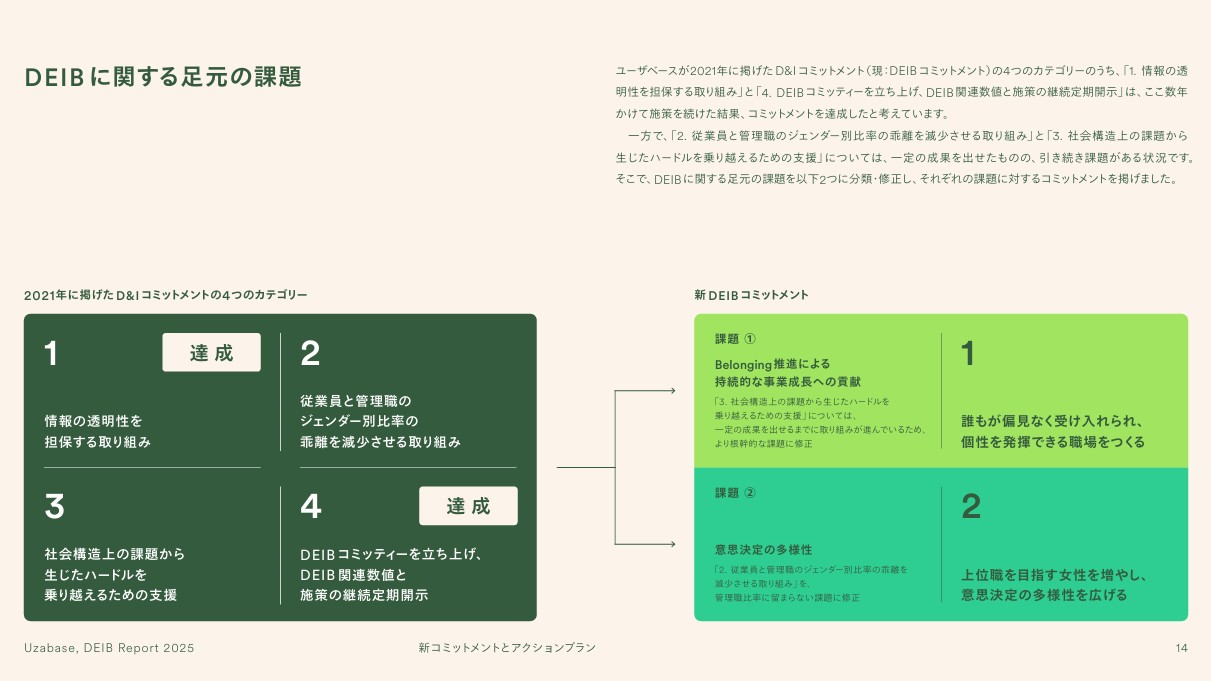 松井さん:当社は2025年5月に「DEIB Report 2025」を公開し、2021年度に掲げたコミットメントを刷新しました。4カテゴリーのうち、これまでの数年で2カテゴリーは達成した一方で、「従業員と管理職のジェンダー別比率の乖離を減少させる取り組み」と「社会構造上の課題から生じたハードルを乗り越えるための支援」は引き続き取り組むべき課題だと考えています。それぞれの課題を修正しアクションプランを策定したので、まずはこの課題を解決していくことが私の目標です。