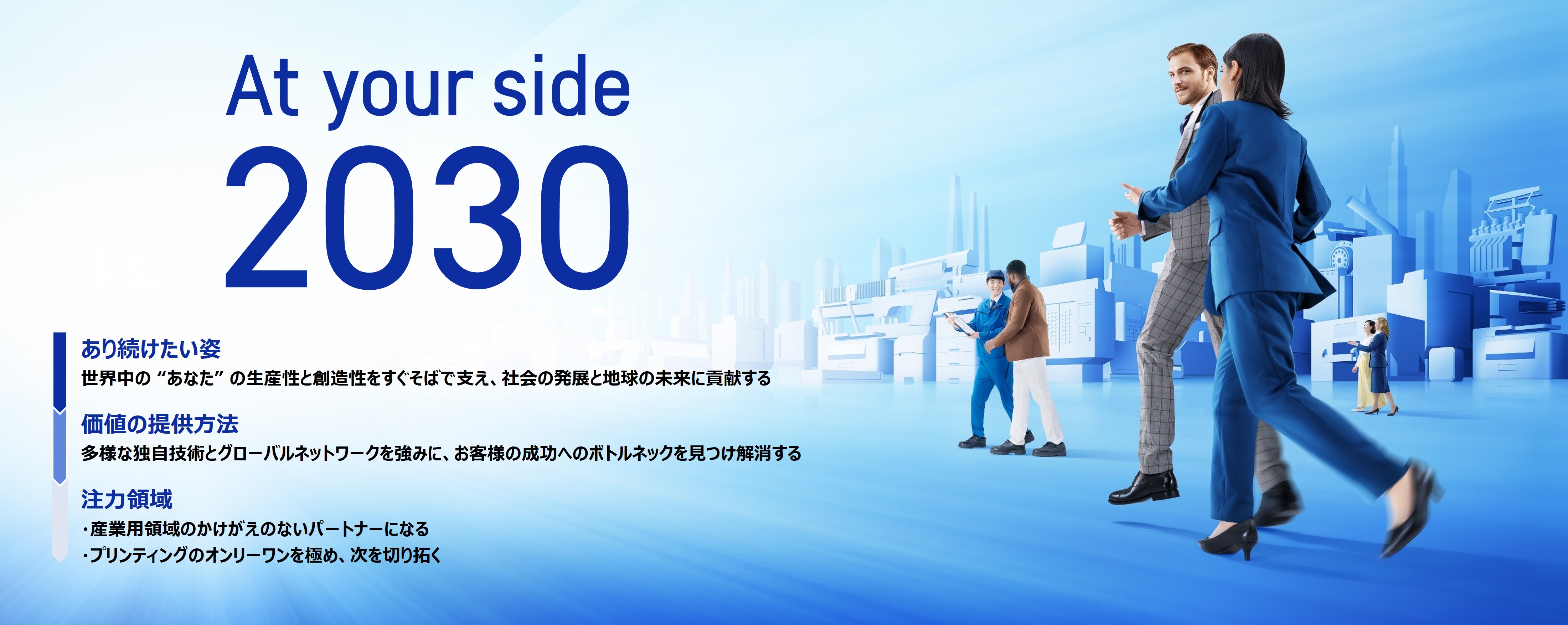 岡田さん:ブラザーは、変化の激しい時代に対応しながら、企業として持続可能な成長を実現していくために、2022年にブラザーグループビジョン「At your side 2030」を打ち出しました。これは、2030 年に向けてお客様にどのような価値を提供していくのか考え、ブラザーの存在意義を再定義した「あり続けたい姿」を起点に、どのような方法で価値を提供するのか(「価値の提供方法」)、何を実現するのか(「注力領域」)を示したものです。