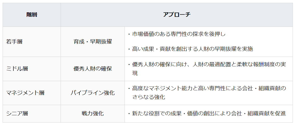 岡田さん:今回の人事制度改革は、「入社から定年まで、すべての階層が良さを感じる」ことを目標にしました。そのため、制度設計も「4世代別アプローチ」で進めています。年功序列ではなく、成果と挑戦を基準に、全世代に正しく報いることを重視しました。