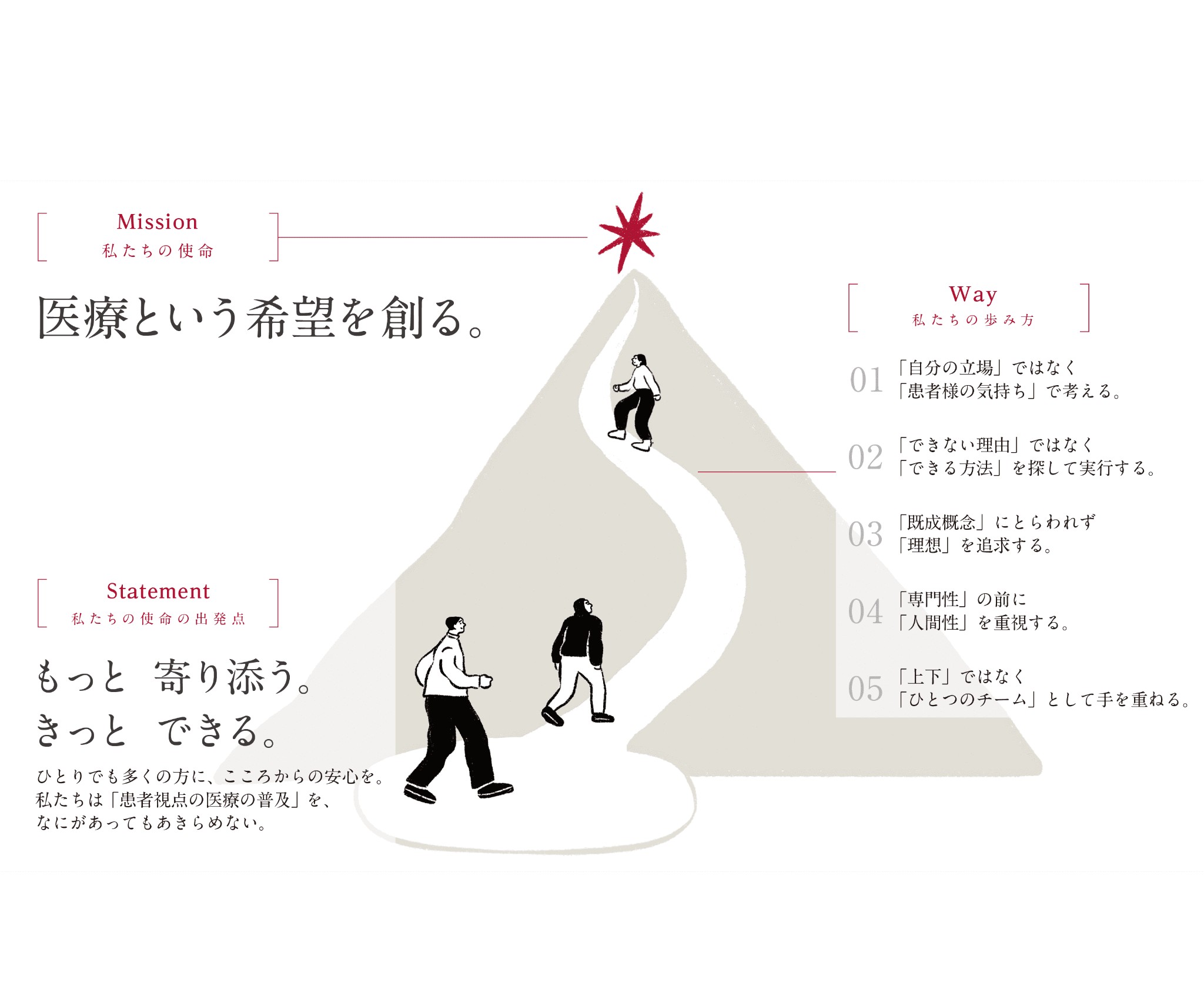 松浦さん:そうですね。現在、国内外で約40の連結子会社でCUCグループが構成され、各事業において支援や運営を行う国内の拠点数を合わせると300を超えます。こうしたグループ企業とご支援先の医療法人様を合わせた共同体を、私たちは「CUCパートナーズ」と定義しています。そして、すべての従業員に共通するミッション「医療という希望を創る。」を軸に、ステートメントと、5つのWayを総称して「CUC Partners Philosophy」を掲げているんです。